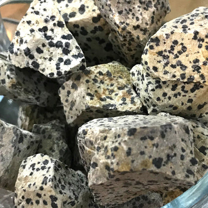 Dalmatian Jaspis on viehättävä, mustien tai tummanruskeiden pilkkujen täplittämä vaaleanharmaa tai luunvärinen jaspis-lajike, joka muistuttaa väritykseltään dalmatiankoiran turkkia. Se on ilon ja leikkisyyden kivi, ja sitä arvostetaan sen kyvystä tuoda elämään positiivisuutta, lievittää negatiivisuutta ja tukea maadoitusta sekä itsensä hyväksymistä.
