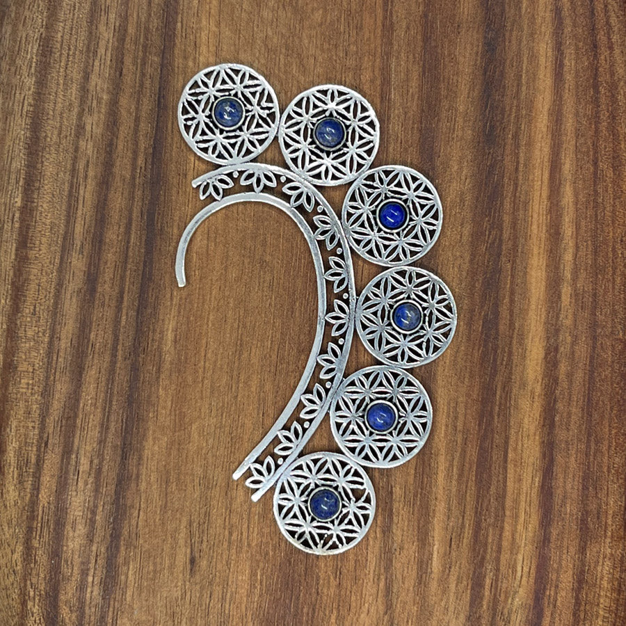 Intiassa valmistettu ear cuff on tehty kevyestä, nikkelivapaasta korumetallista, 10 cm korkeus ja 5,5 cm leveys