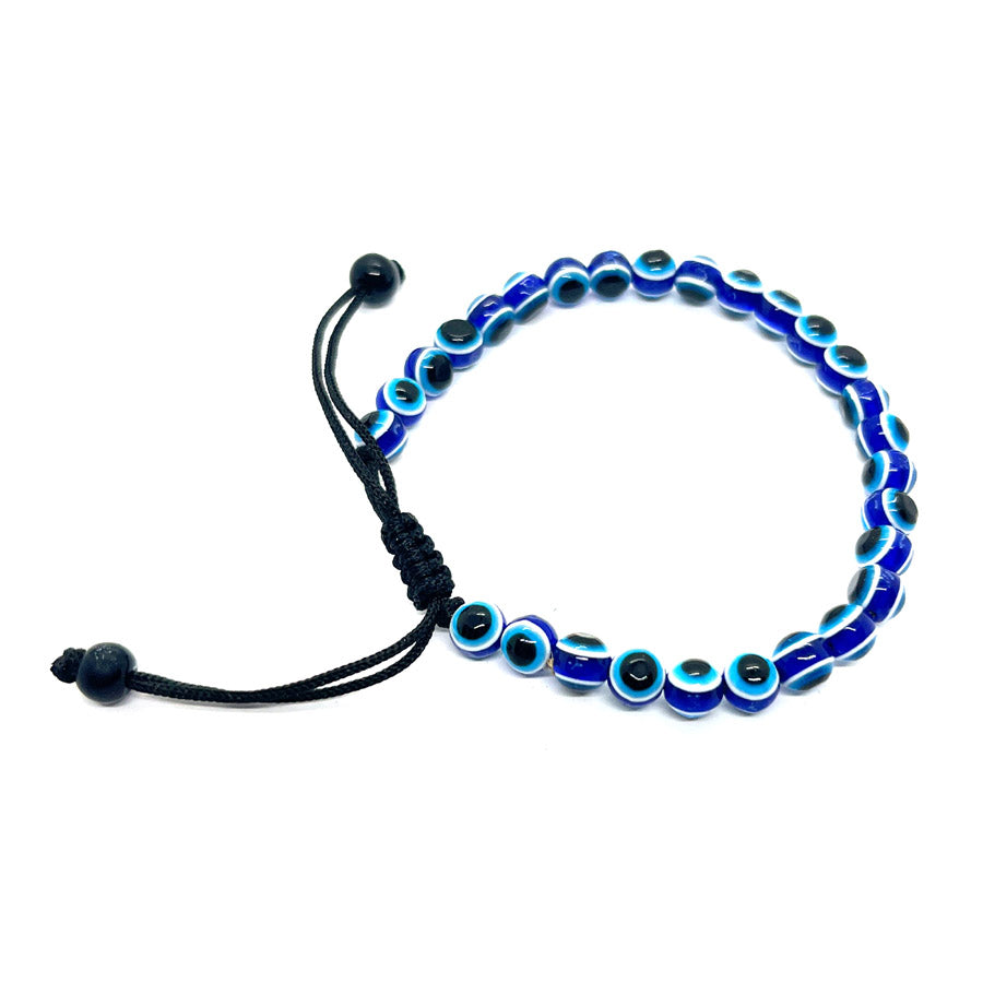 Nylonnarusta punottu ranneke on koristeltu runsaasti evil eye -koruhelmillä, jotka peittävät sen koko mitalta. Rannekkeen koko on helposti säädettävissä siirtyvällä solmulla, mikä takaa mukavan istuvuuden useimmille.