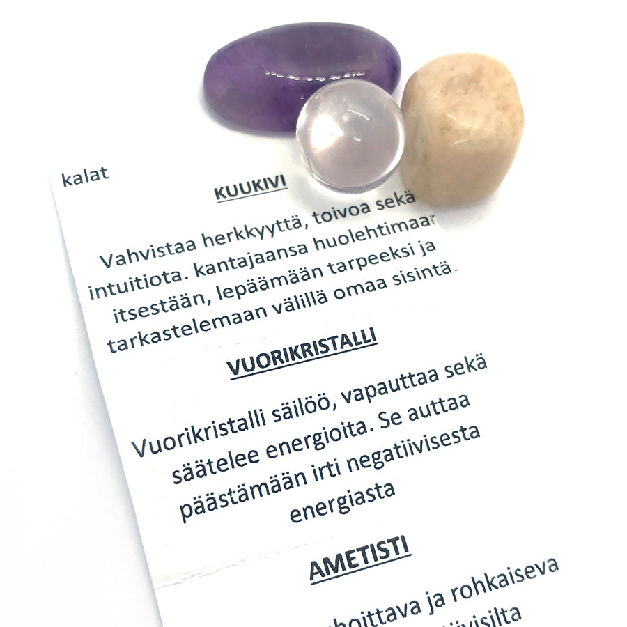 Horoskooppikivi-pakkaukseen kuuluu kolme kiveä onnenkivien valikoimastamme, esimerkiksi: