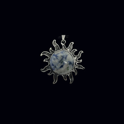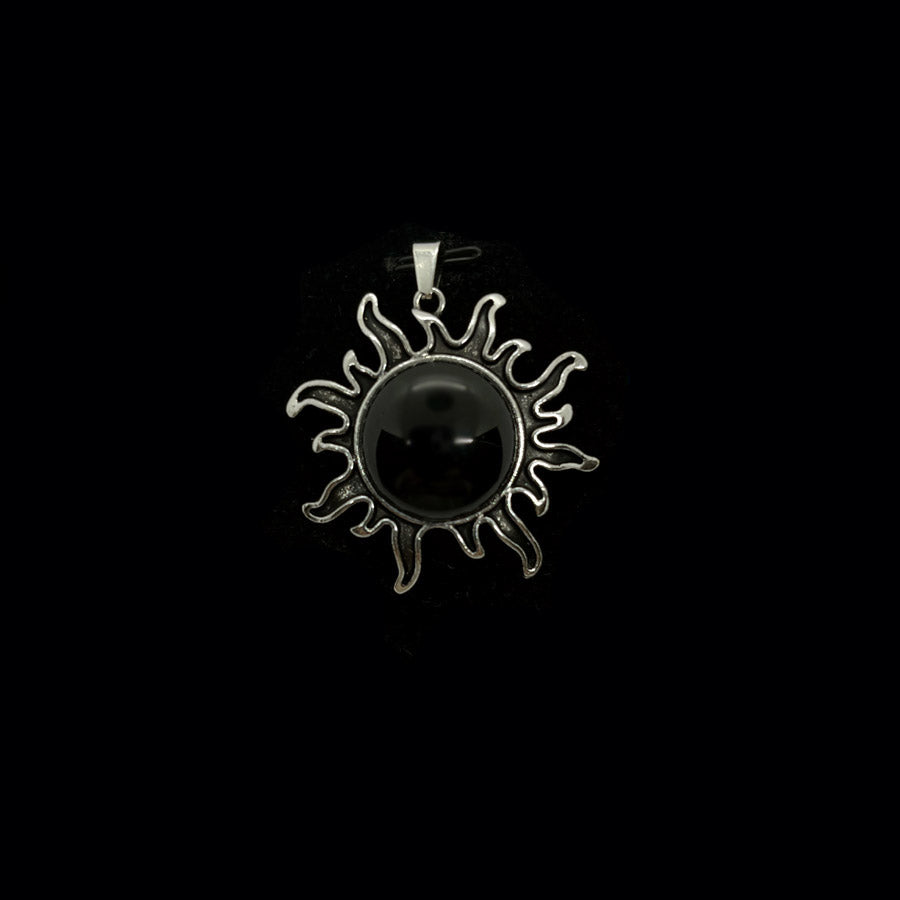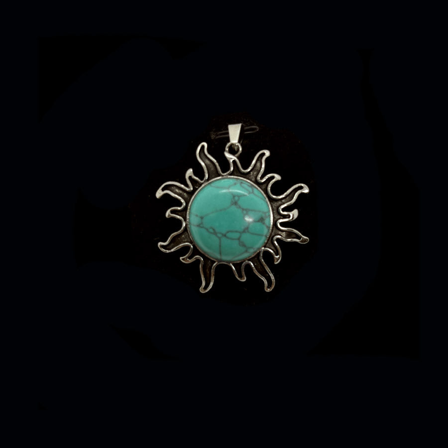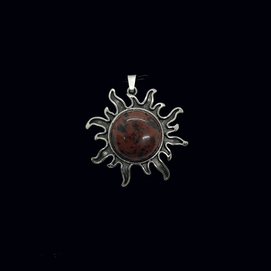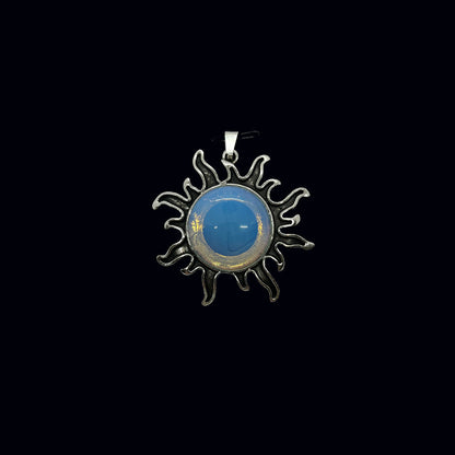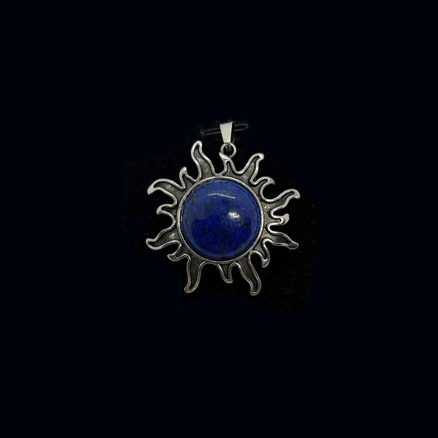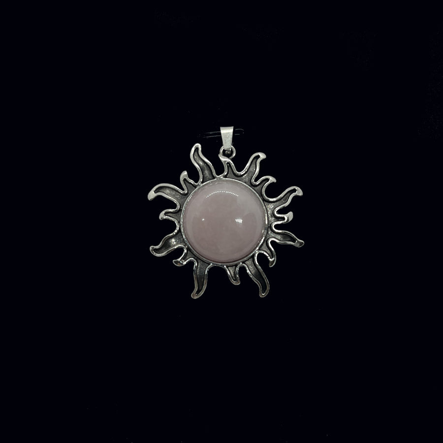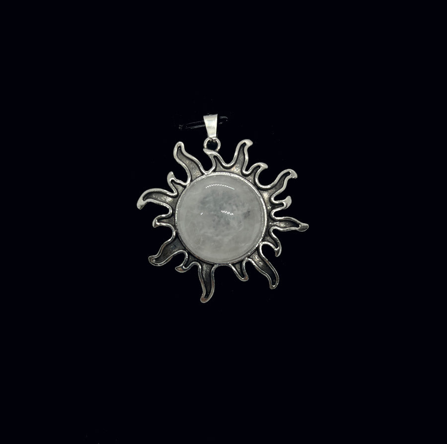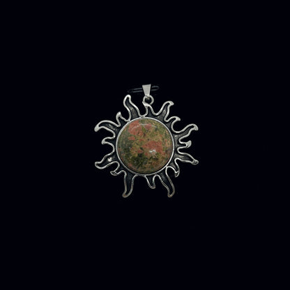 Riipuksen keskellä on patinoituun metalliseen kehykseen upotettu, hiottu puoliympyrän muotoinen kristalli tai energiakivi. Lopputulos muistuttaa liekehtivää aurinkoa. Korun halkaisija n. 4 cm, kiven n. 2 cm. Ripusta haluamaasi ketjuun, nauhaan, lenkkiin...