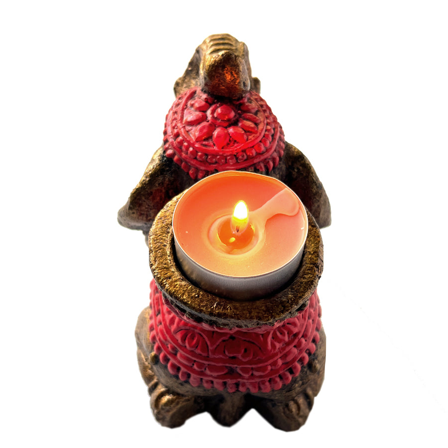 Polvistuva norsu kantaa selässään pienen teelyhdyn: onnea tuovan norsun kärsä ylväästi kohoaa kohti valoa.