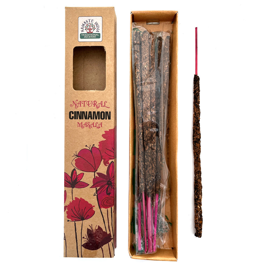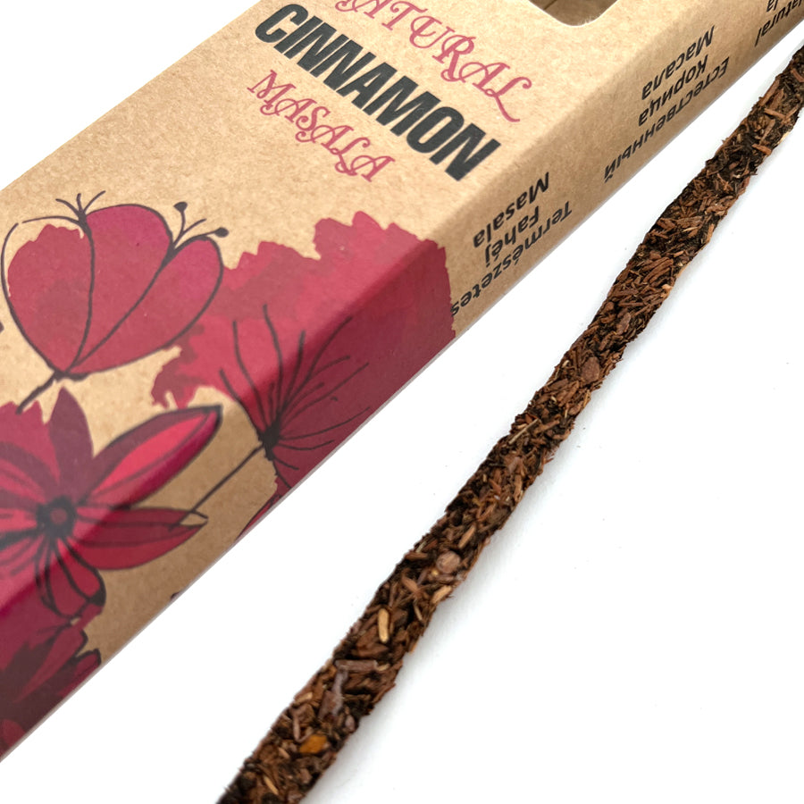 Natural Masala suitsukkeet on päällystetty aidolla santelipuun lastulla. Tuoksuna Cinnamon, kanelin makea ja maanläheinen tuoksu, Intian ja Sri Lankan mauste.