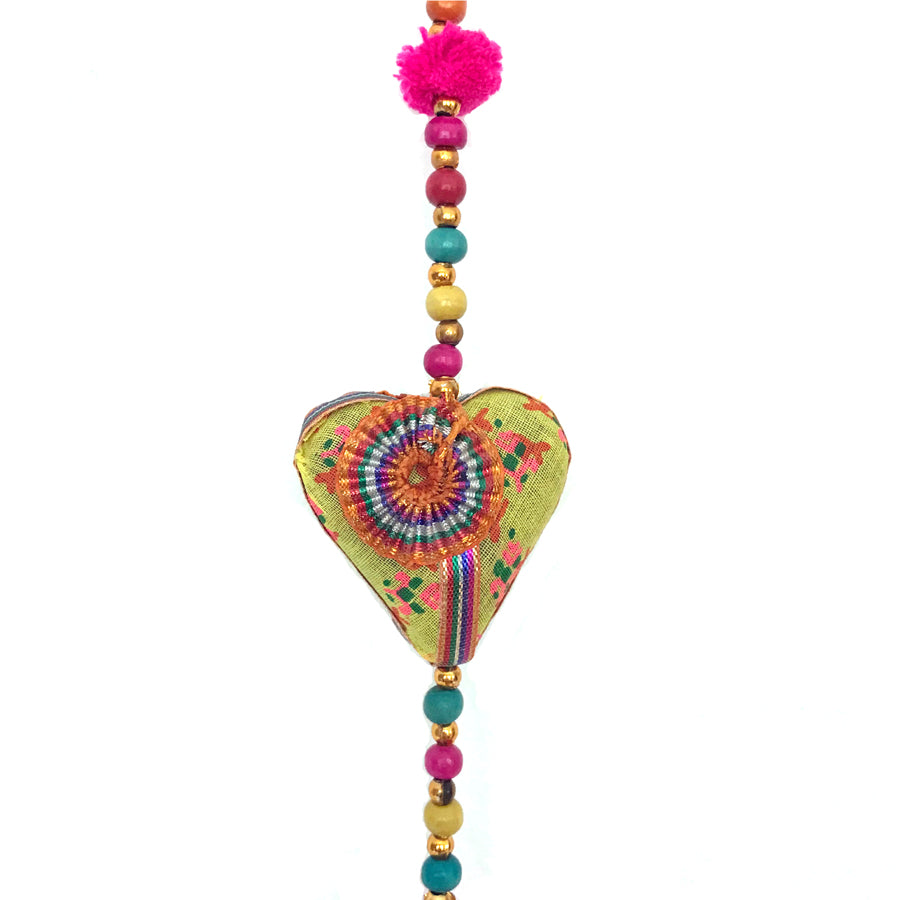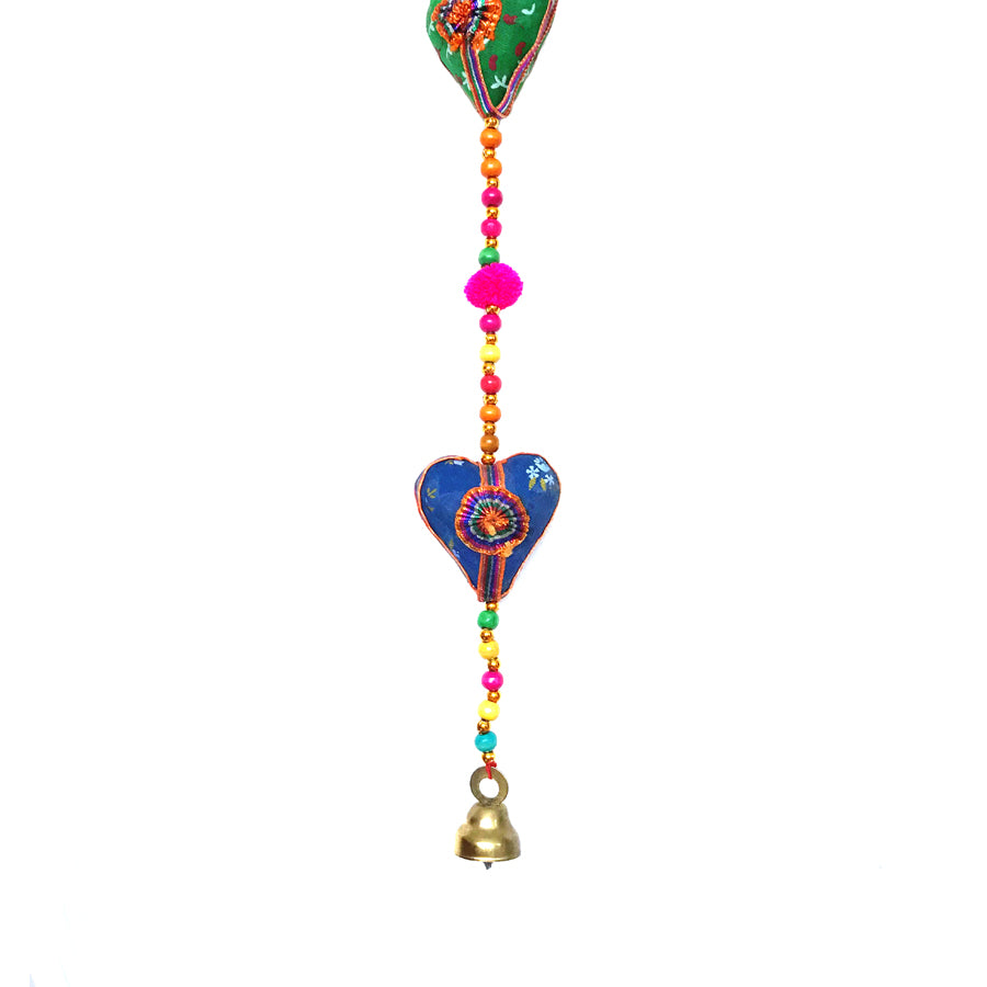 Pitkä, käsityönä Intiassa valmistettu koriste, joka tuo kotiin väriä, iloa ja ripauksen etnistä tunnelmaa. Koristeessa roikkuu viisi pehmeää, kangaspäällysteistä sydäntä, joiden välejä rytmittävät koristehelmet ja pinkit pienet pompomtupsut.