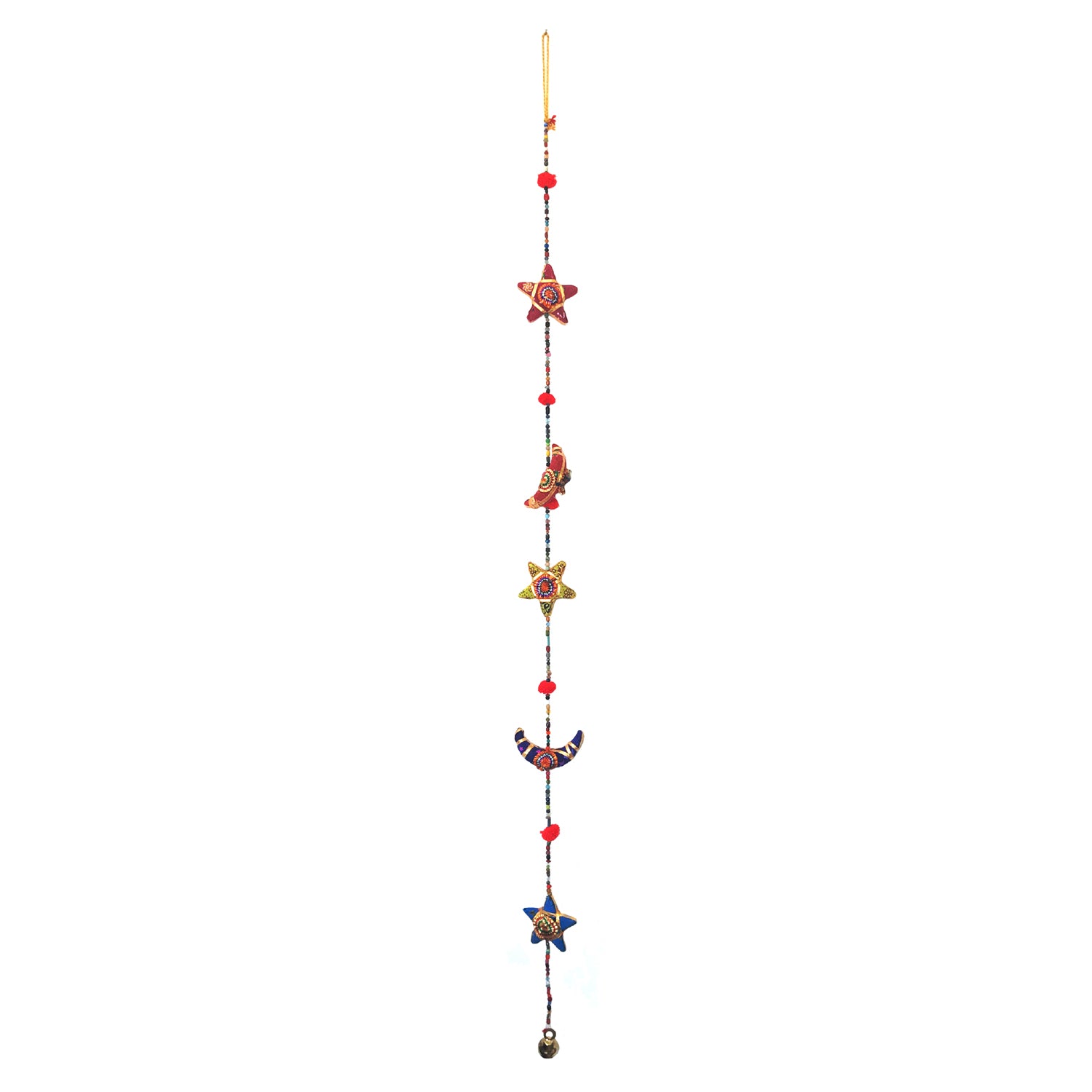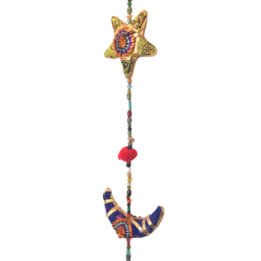 Pitkä, käsityönä Intiassa valmistettu koriste, joka tuo kotiin väriä, iloa ja ripauksen etnistä tunnelmaa. Koristeessa roikkuu viisi pehmeää, kangaspäällysteistä tähteä ja kuuta, joiden välejä rytmittävät koristehelmet ja pinkit pienet pompomtupsut.