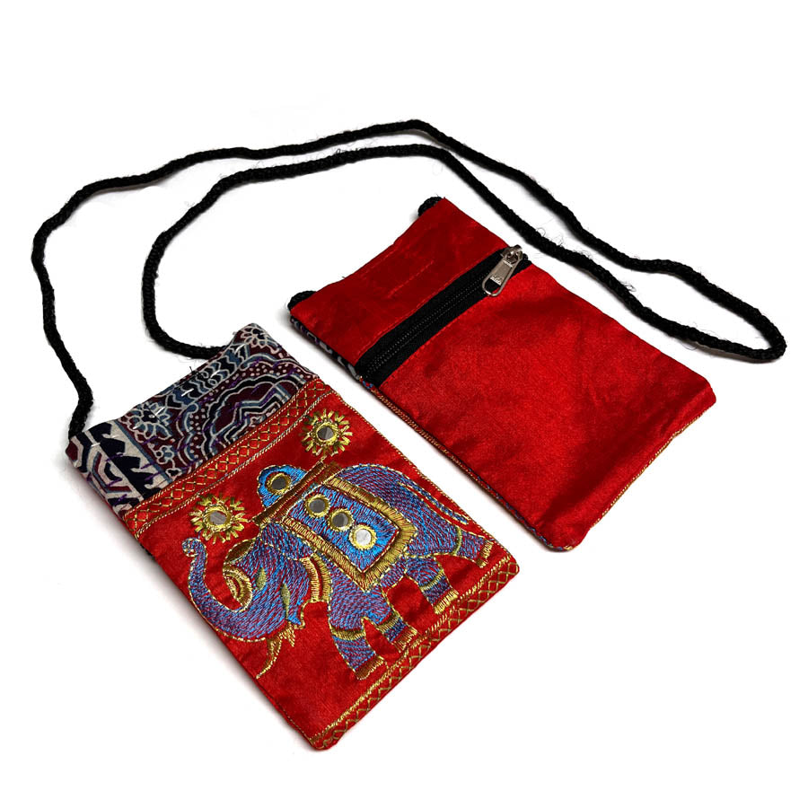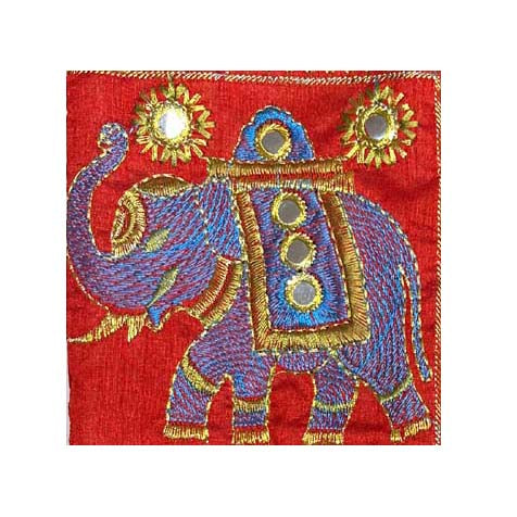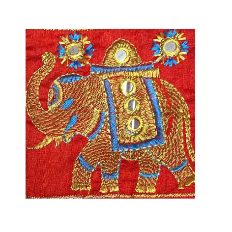 Laukun punaista kangasta koristaa upea, kirjailtu norsuaihe, jota täydentävät pienet peili-applikoinnit.