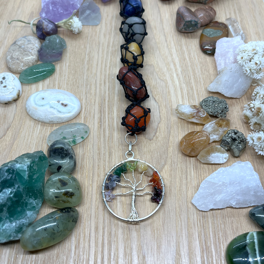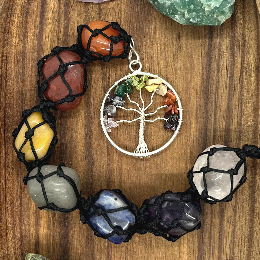 Tämä ainutlaatuinen, käsin tehty koriste yhdistää voimakivet ja symbolisen elämänpuun. Noin 25 cm pitkä solmittu kiviverkkoketju pitää sisällään valikoidut, aidot kivet ja kristallit, jotka on valittu edustamaan kehon seitsemää chakraa.