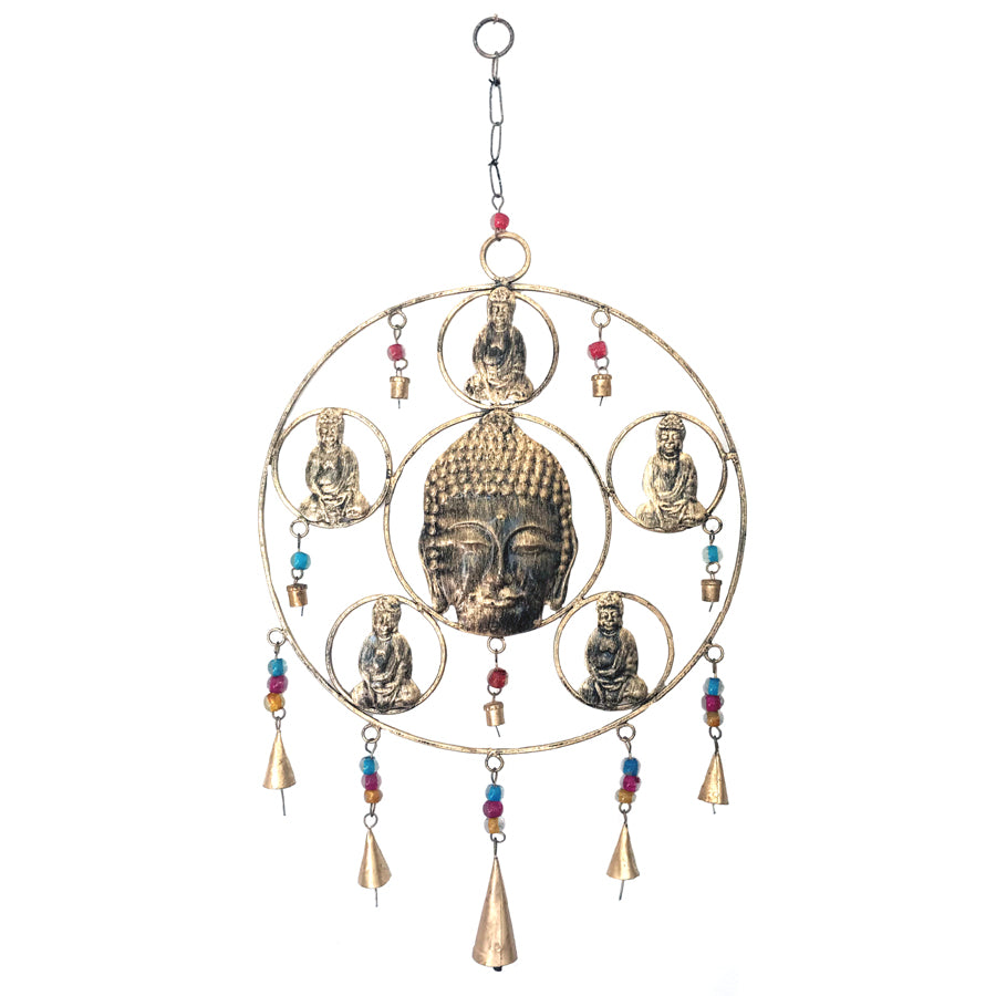 Suurikokoinen, Intiassa käsityönä valmistettu koriste on kuin meditaation mandala. Keskellä kohoaa Buddhan pää pienemmän ympyrän sisällä kuin hiljaisuuden ja valaistumisen ydin. Sitä ympäröi viisi pienempää ympyrää, joiden sisällä istuvat meditoivat Buddhat.