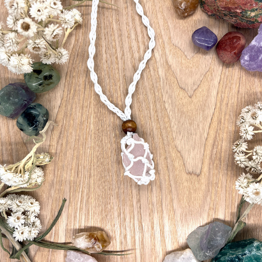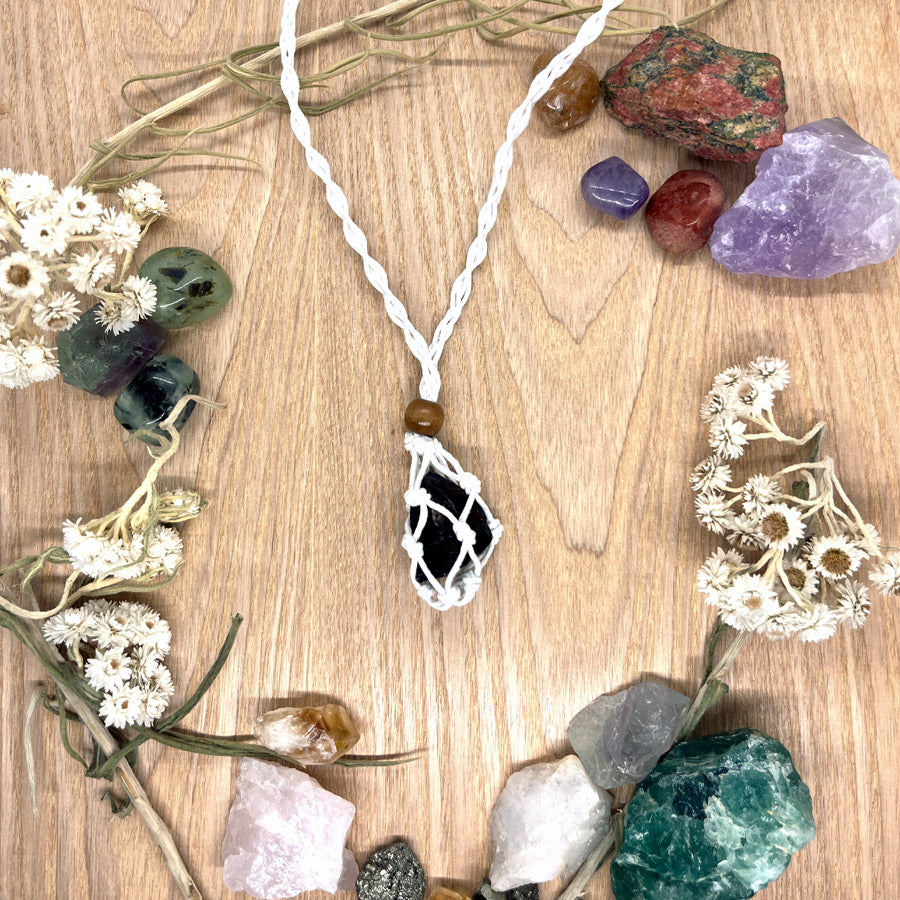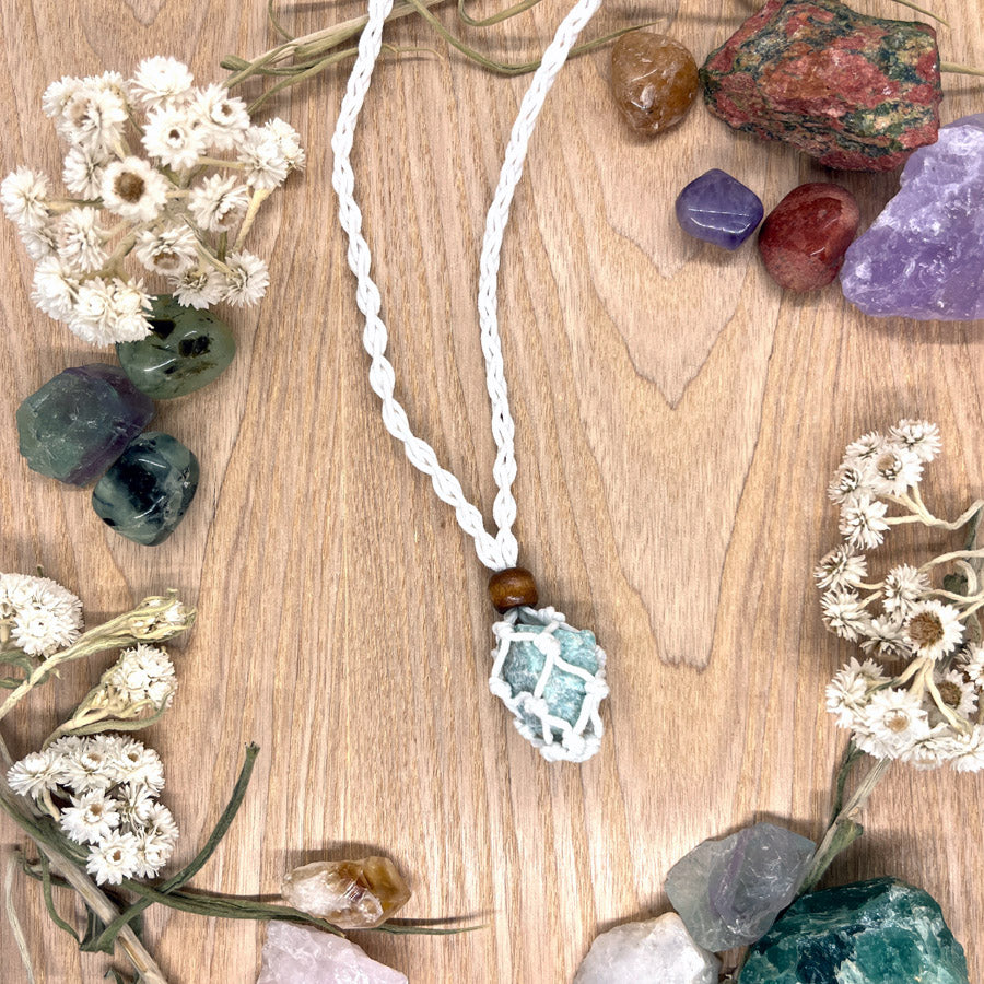 Käsin punottu, valkoinen kaulakorunauha on valmistettu kestävästä langasta ja sen päässä on pieni makrameeverkko, johon saat aseteltua minkä tahansa kiven. Verkko on helppo avata ja sulkea siirrettävällä puuhelmellä. Korun pituus on säädettävissä toisen puuhelmen avulla, joten voit muokata sitä juuri itsellesi sopivaksi.