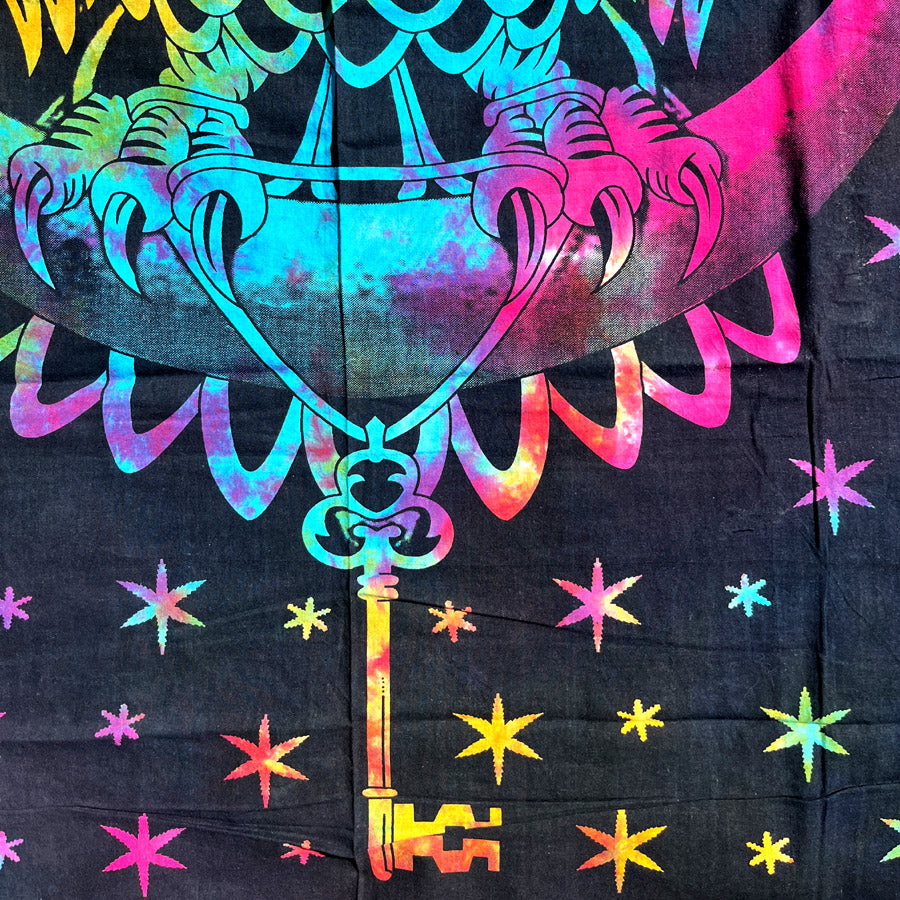 Kestävä ja helppohoitoinen 100% puuvillainen sisustuskangas tuo tilaan mystistä energiaa ja visuaalista dramaattisuutta. Intiassa käsinpainettu kuva on painettu multicolor tie-dye pohjalle luoden hypnotisoivan ilmeen. Jokainen kappale on uniikki ja aidosti käsityön leimaama.