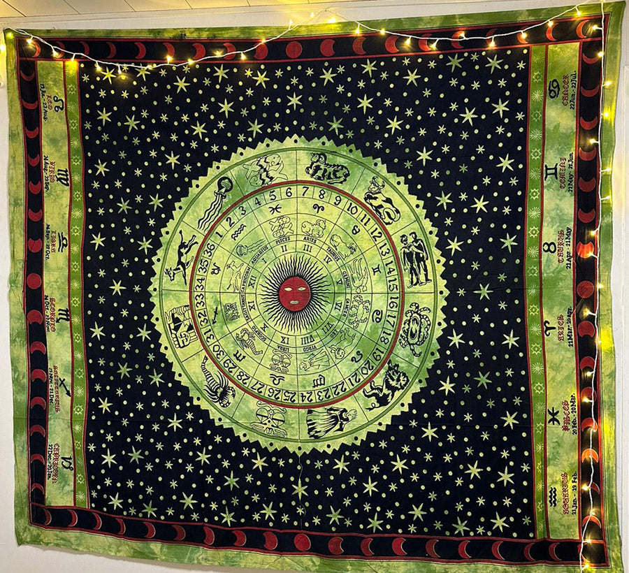 Horoskoopin eläinradan merkit kertovat tarinaa kosmisesta yhteydestä ja yksilöllisestä kohtalosta. Aurinko, astrologian ydin, säteilee voimaa kankaan keskustassa, sen ympärillä eläinradan symbolit kuvastavat ajan kulkua ja taivaallisia vaikutuksia.