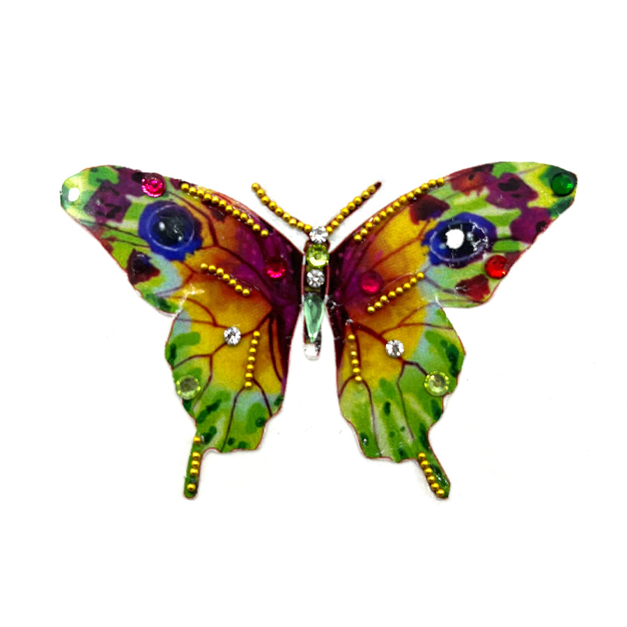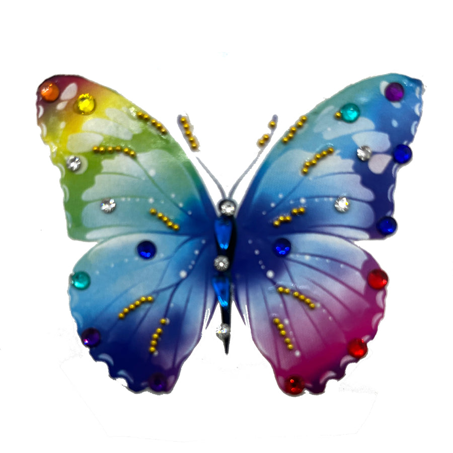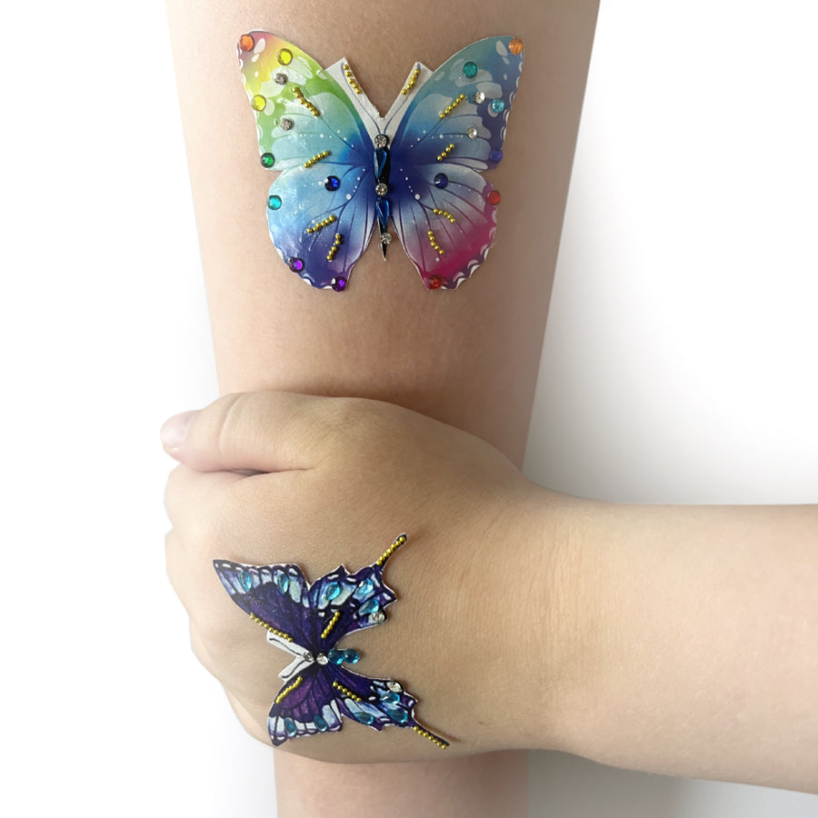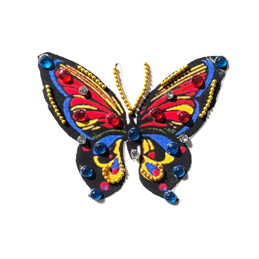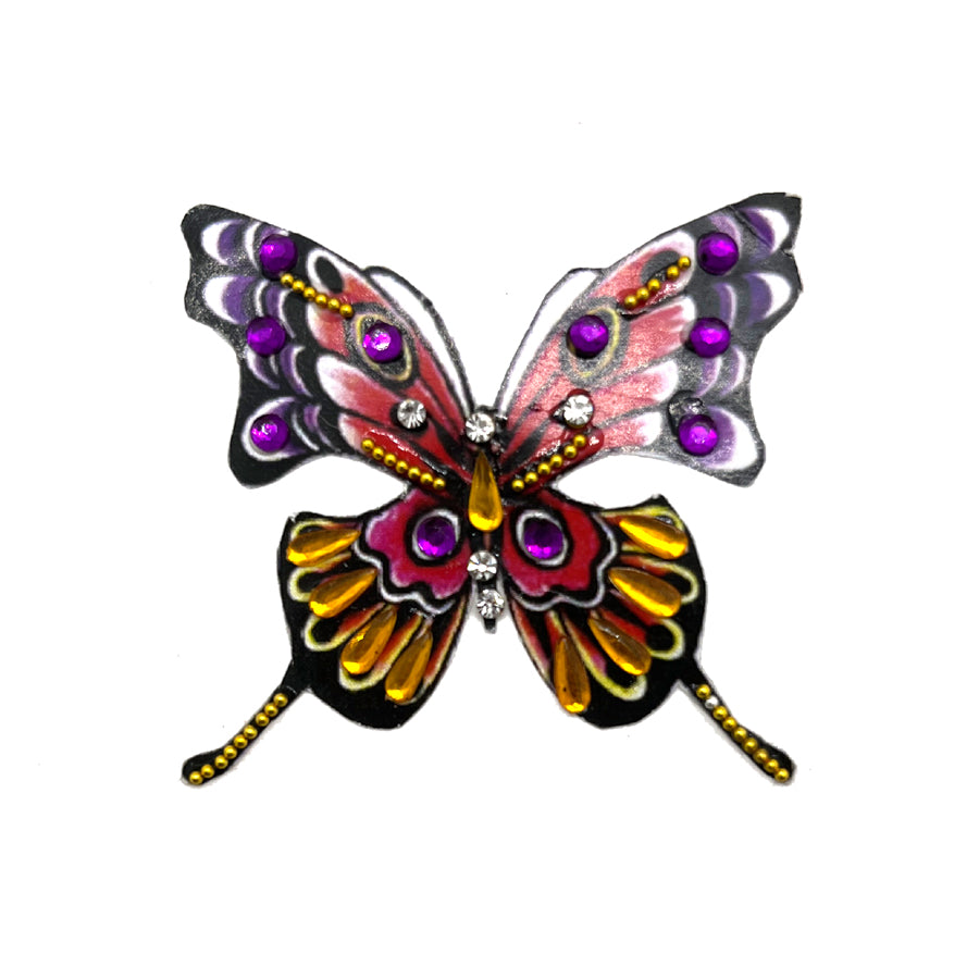 Intiassa koristellut tarrat, joissa perhonen levittää siipensä kimaltavien koristeyksityiskohtien kanssa. Jokainen tarra on uniikki – kimalluksen sävyt saattavat vaihtua hitusen.
