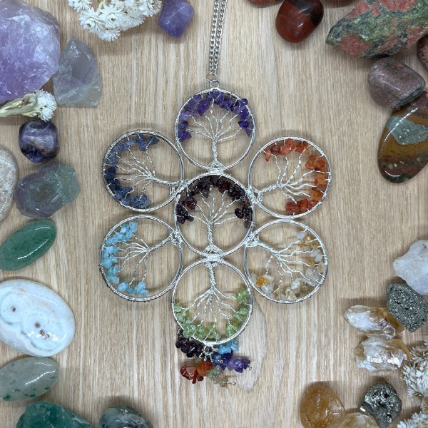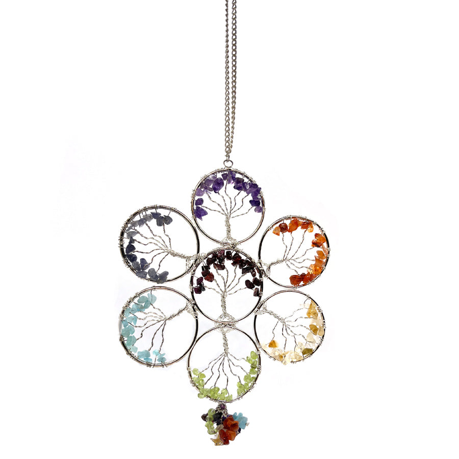 Seitsemän taidokkaasti punottua elämänpuuta, joiden lehvästöt muodostavat chakrojen väriset, hohtavat puolijalokivet. Elämänpuukehien muodostaman kuvion alareunasta roikkuu kivikoriste.