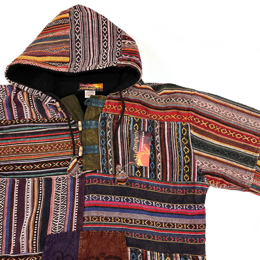 Tämä ainutlaatuinen ja paksu hupparitakki on valmistettu Nepalin käsityöperinnettä noudattaen. Takki on syntynyt yhdistämällä lukuisia pieniä, kuviollisia paloja paksua Gheri-tyyppistä kangasta (kudottua puuvillaa) erittäin moniväriseksi, kuviolliseksi pinnaksi. Lopputuloksena on silmiinpistävä boheemi "Baja"-kuosi, joka henkii rentoa seikkailumieltä ja kestävyyttä.