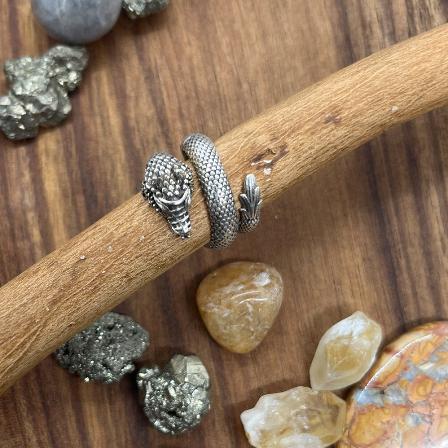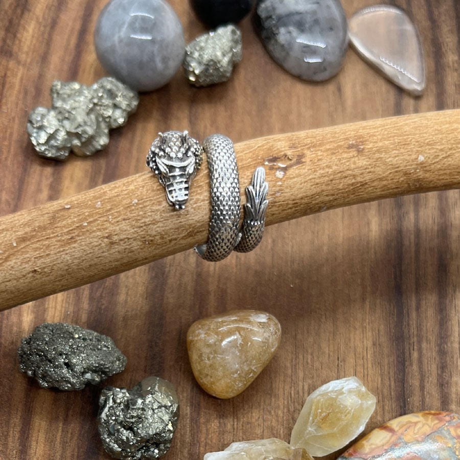 Tämä majesteettinen sormus esittää lohikäärmettä, joka kietoutuu suojelevasti sormesi ympärille. Sormuksen päässä komeilee yksityiskohtainen lohikäärmeen pää, jonka suomupintainen, eläväinen runko jatkuu sormen ympäri ja päättyy muotoiltuun pyrstöön. Sormuksen muotoilu on voimakas ja dramaattinen, luoden kantajalleen ainutlaatuisen ilmeen.
