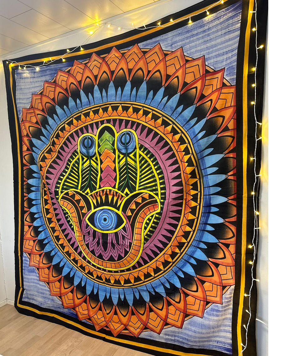 Kuvittele tämä batiikkivärjätty kangas seinälläsi tuomassa jännittävää tunnelmaa, päiväpeittona tuomassa tyyliä makuuhuoneeseen, tai verhona suodattamassa valoa pehmeästi. Se sulautuu myös piknik-viltiksi. Huonekalujen, kuten sohvien ja nojatuolien päällä, se lisää kodikkuutta ja tuo sisustukseen väriterapiaa ja iloa.