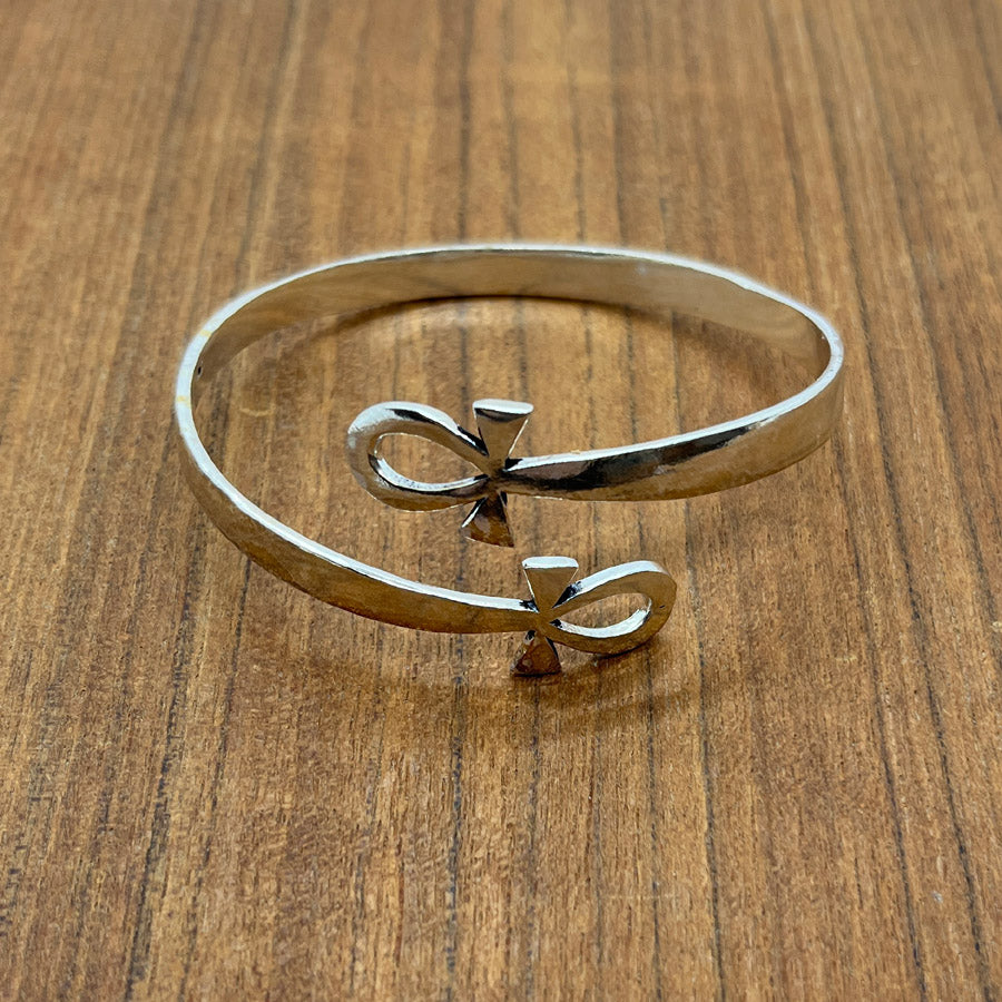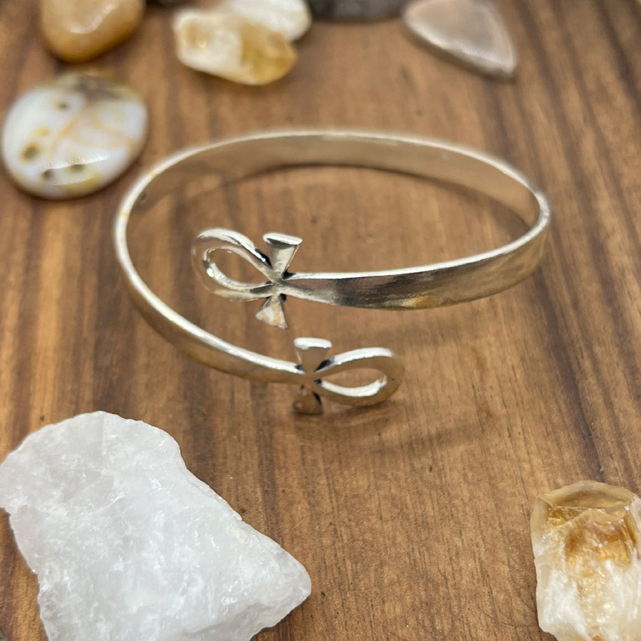 Upea ja elegantti Ankh-käsirengas on valmistettu korkealaatuisesta hopeanvärisestä korumetallista. Käsirenkaan kaksi päätä kohtaavat tyylikkäästi, ja kumpaakin niistä koristaa oma Ankh-symboli.