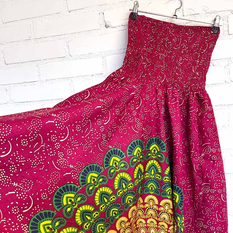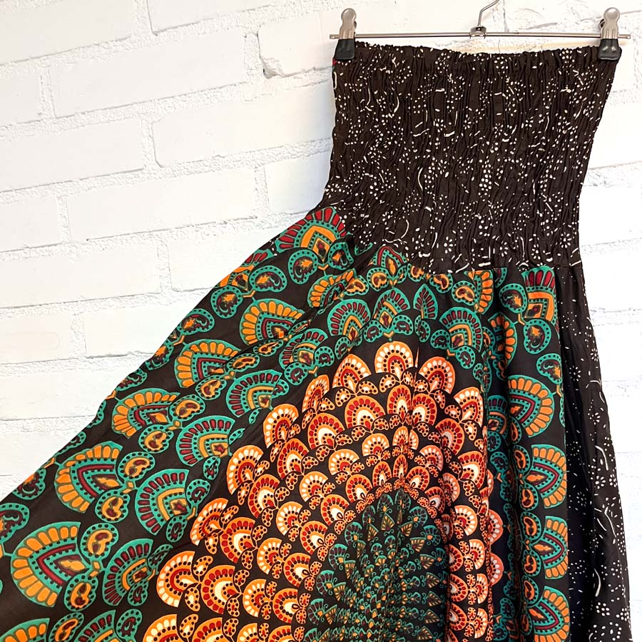 Housuja koristaa henkeäsalpaava, suuri mandala-kuvio, joka muistuttaa riikinkukon pyrstöä.Leveä ja mukava kuminauharypytys vyötäröllä, mikä mahdollistaa pukemisen myös lyhyenä mekkona/haalarina.