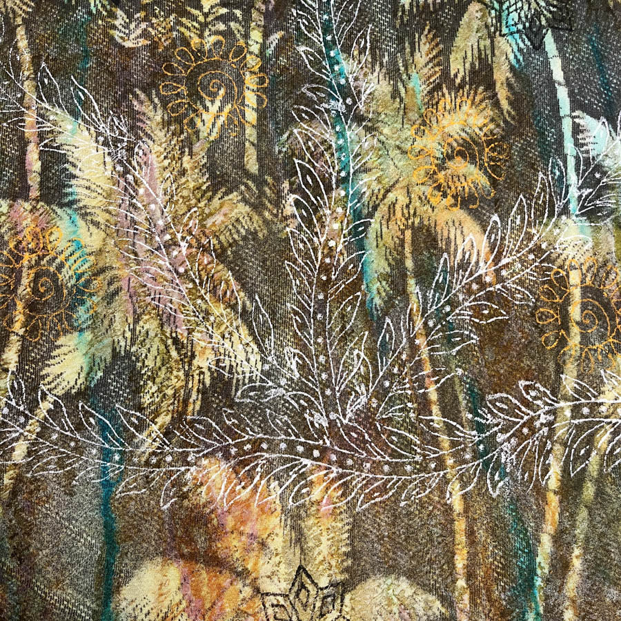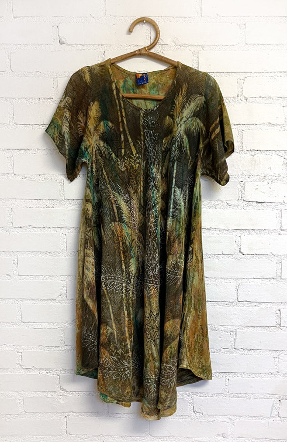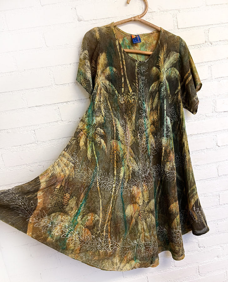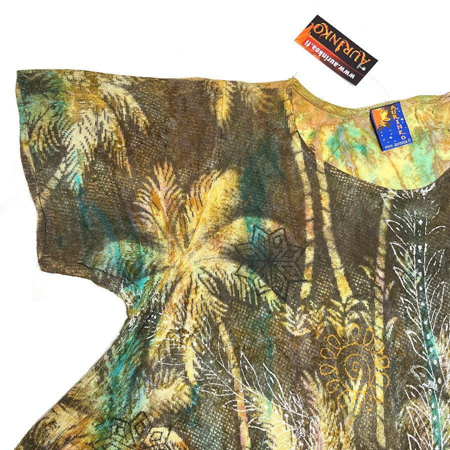 Väljä tunikamekko, jonka maanläheiset sävyt (kuten ruskea, sammaleen vihreä ja keltainen pienellä turkoosin pilkahduksella) luovat vaikutelman käsin maalatusta taideteoksesta.