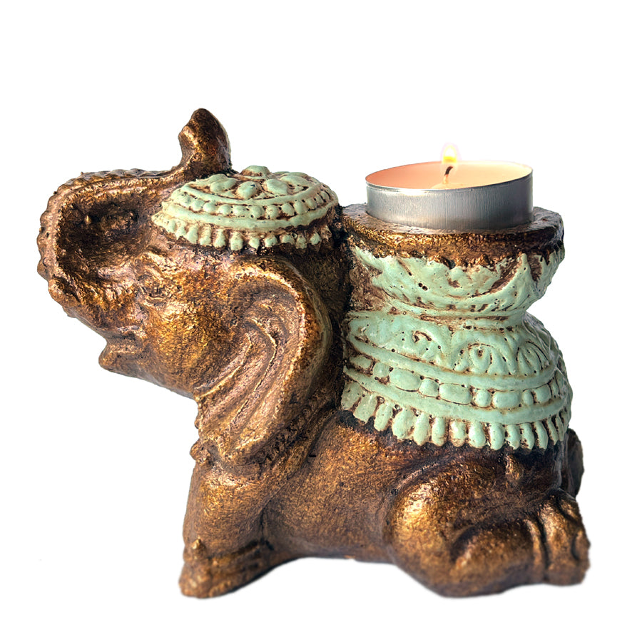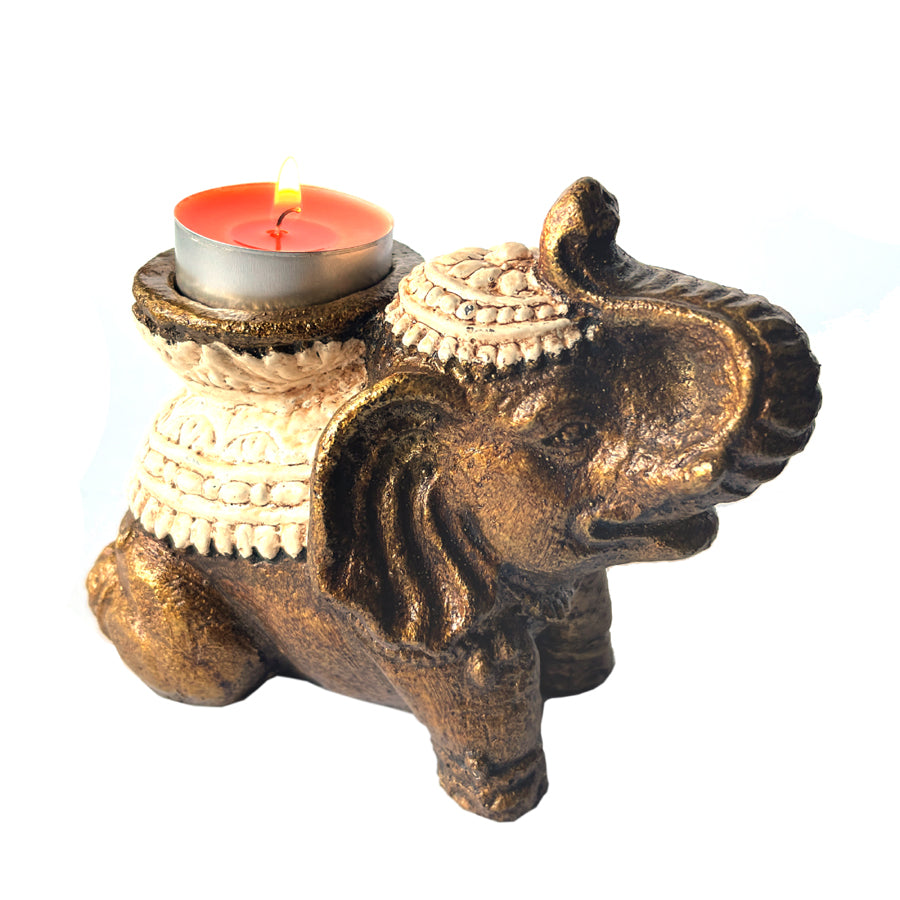 Polvistuva norsu kantaa selässään pienen teelyhdyn: onnea tuovan norsun kärsä ylväästi kohoaa kohti valoa.