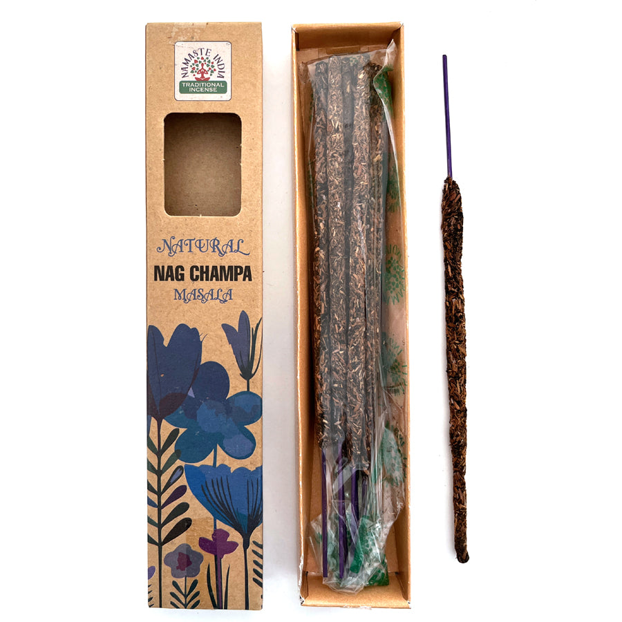 Natural Masala suitsukkeet on päällystetty aidolla santelipuun lastulla. Tuoksuna Nag Champa, Intian alueelta kotoisin olevan kukan makea tuoksu.
