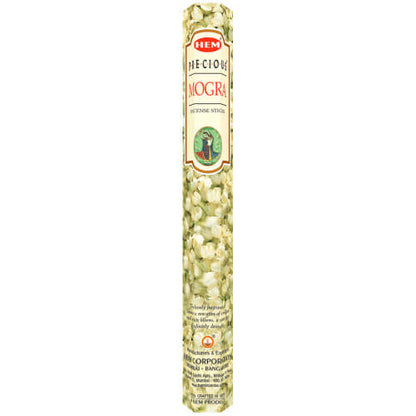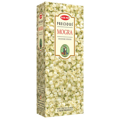 HEM Precious Mogra -suitsukkeet ovat korkealaatuisia, pitkäkestoisia ja aromaattisia suitsuketikkuja. Mogra, joka tunnetaan myös jasmiinin huumaavana tuoksuna, tuo mieleen miljoona pientä valkoista kukkaa.
