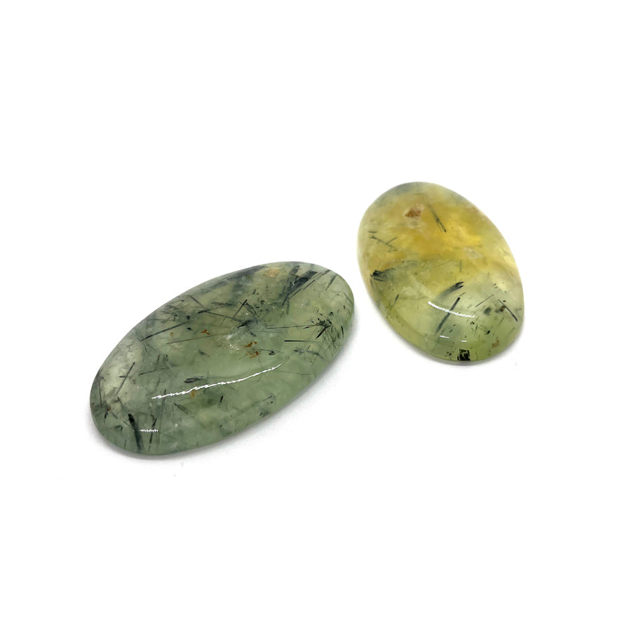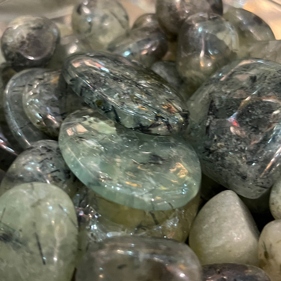 Prehniitti on kalsium-alumiinisilikaattimineraali, jonka väri on yleensä vaaleanvihreä tai kellertävänvihreä, ja se kiteytyy usein pallomaisina muodostelmina. Musta turmaliini (Schorl) esiintyy siinä tummina neulasmaisina sulkeumina. Tämä yhdistelmä on erittäin ainutlaatuinen: prehniitin pehmeä, hoivaava energia yhdistyy turmaliinin voimakkaaseen maadoitukseen ja suojeluun.