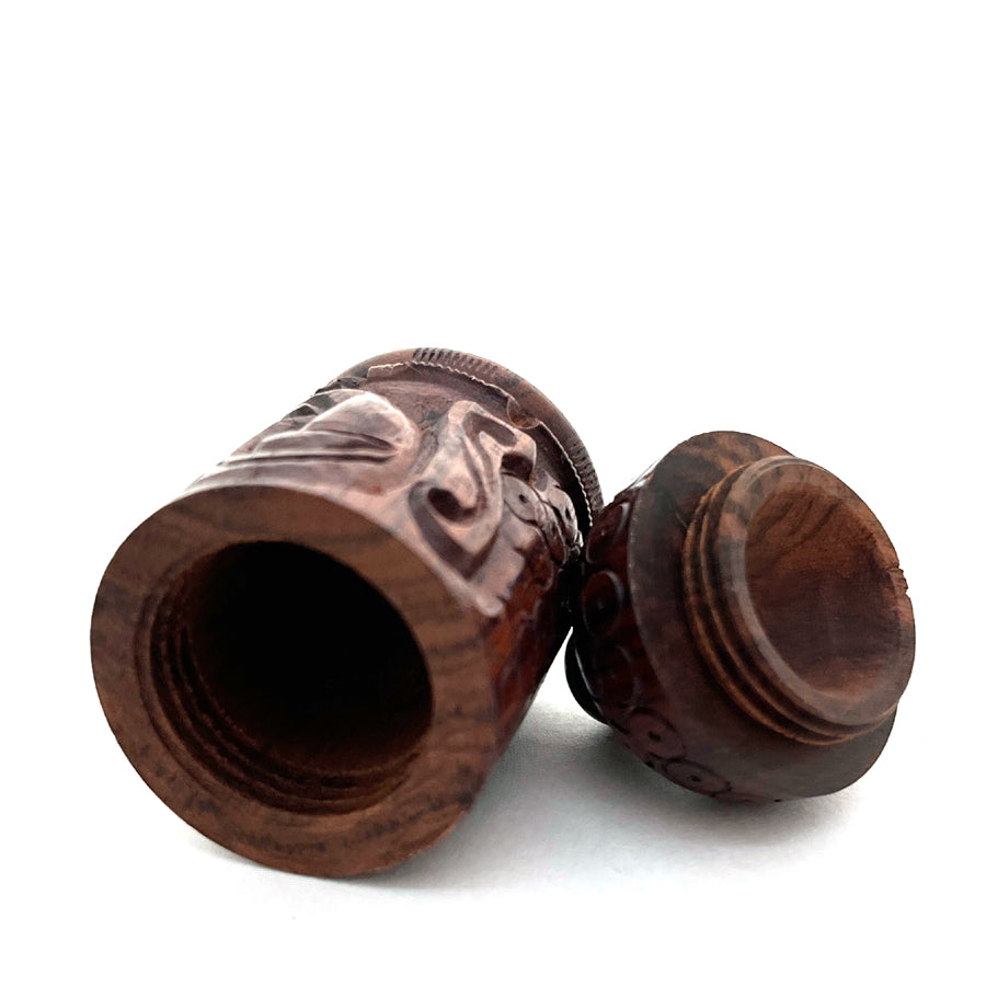 Tummasta puusta kaiverrettu Buddhan pään muotoinen rasia on hieno esimerkki intialaisesta käsityötaidosta. Rasia on veistetty yksityiskohtaisesti, ja sen yläosa – Buddhan hiukset – toimii kierrekantena, joka sulkeutuu tiiviisti ja suojaa sisältöä kuin hiljainen ajatus.