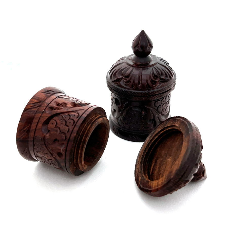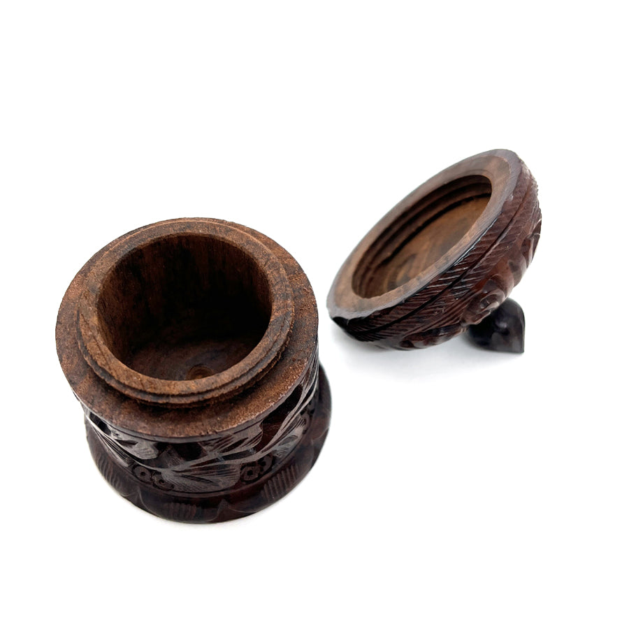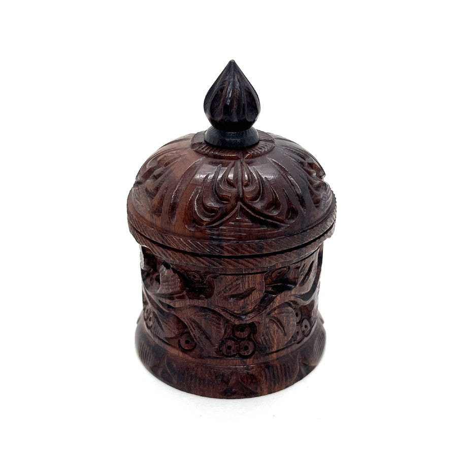 Intiassa käsityönä valmistettu tumma puurasia, jonka puolipyöreä kansi sulkeutuu kiertein ja viimeistelee kokonaisuuden sirolla nupilla. Rasian sivun hienovaraiset köynnöskaiverrukset kiertyvät puun pintaa kuin hiljalleen etenevä kasvi.
