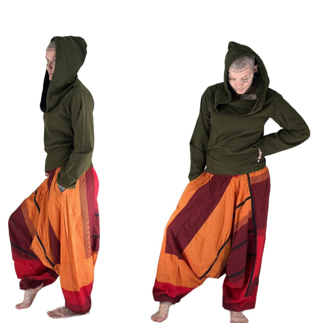Kangaspinnan sävyissä on valinnanvaraa: vaalea harmaa, tumma harmaa, metsänvihreä ja hehkuva puna-oranssi – kaikki Nepalissa värjättyjä. Lahkeiden kuminauhat pitävät leveät haaremihousut muodossaan, kun taas sivutaskut tuovat ripauksen arjen käytännöllisyyttä.