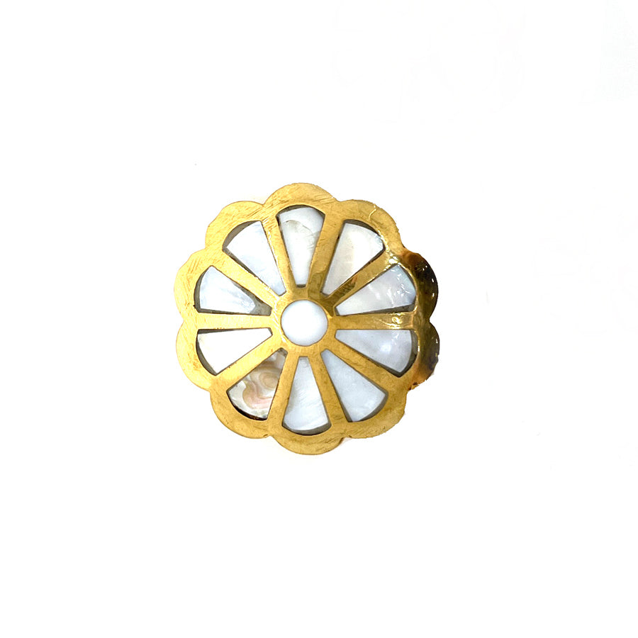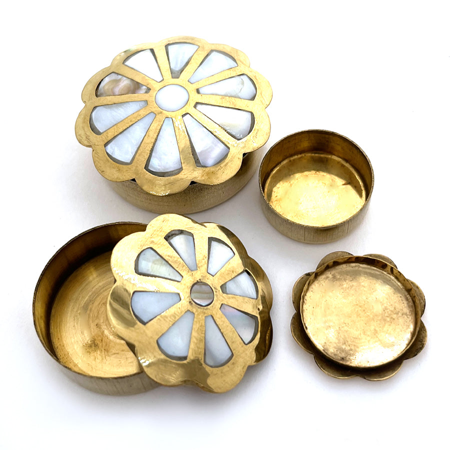 Intiassa valmistettu messinkirasia on koristeltu aidolla simpukan helmiäisellä, joka kimaltelee valossa kuin merenpohjan salaisuus. Käsityönä tehty rasia sulkeutuu tiiviisti ja säilyttää sisällön turvallisesti – olipa kyseessä koru, päivittäiset lääkkeet tai jokin muu pieni aarre.