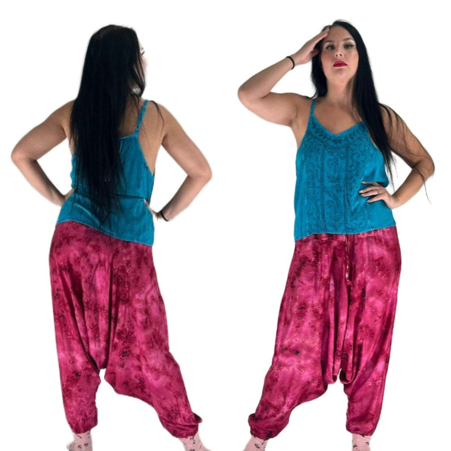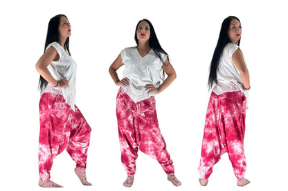 Intiassa käsin valmistetut ja solmuvärjätyt viskoosihousut, joissa vaaleanpunainen pääsee loistamaan kahdessa eri maailmassa: utuisen vaaleana tai syvempänä ja intensiivisenä. Jokainen housupari on ainutlaatuinen – värjäyksen luonne tekee pinnasta elävän ja ilmeikkään.