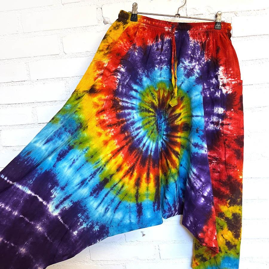 Haaremihousut ovat saaneet yksilöllisen ja eloisan batikkivärjäyksen, jossa värit sekoittuvat toisiensa huimiin pyörteisiin.