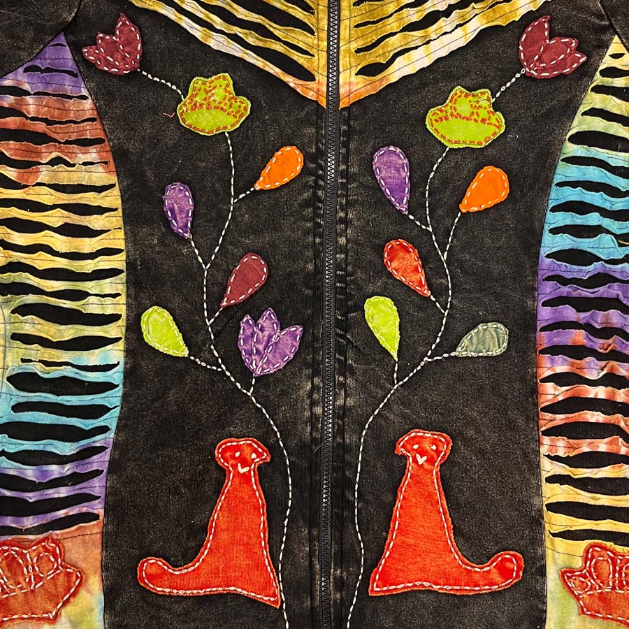 Huppari on valmistettu joustavasta puuvillasta ja koristeltu taidokkaasti tilkkutöillä ja ompeleilla, jotka luovat sille uniikin, etnis-henkisen ilmeen. Koristeltu värikkäillä kissoja, kukkia ja lehtiä kuvaavilla aplikaatioilla ja ompeleilla.