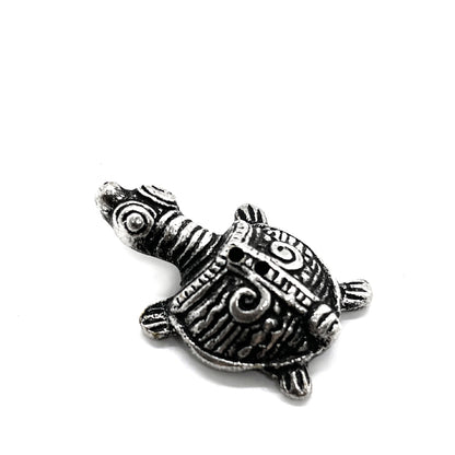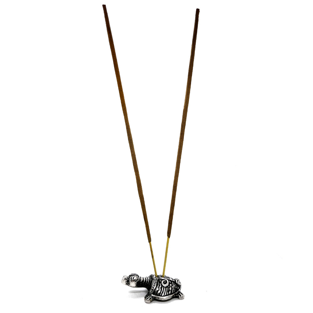 Tämä pieni alumiininen kilpikonnafiguuri toimii suitsuketelineenä yhdelle suitsuketikulle. Kilpikonna-symboli edustaa vakautta, pitkäikäisyyttä ja rauhaa