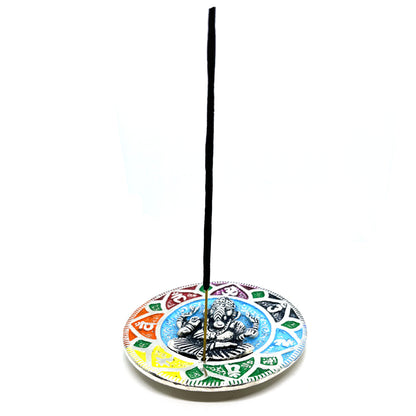Alumiininen suitsuketeline, jonka keskellä Lord Ganesha symboloi viisautta, esteiden poistamista ja uuden alun suojelusta. Seitsemän chakran symbolit kiertävät reunoilla, tuoden tasapainoa ja henkistä voimaa.