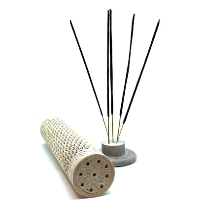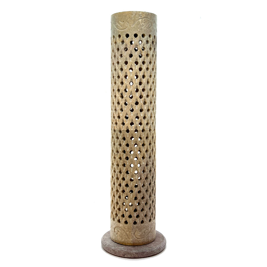 Kaunis intialainen reikäkoristeinen tornimallinen suitsuketeline on valmistettu korkealaatuisesta vuolukivestä, joka kestää lämpöä ja pitkäaikaista käyttöä.