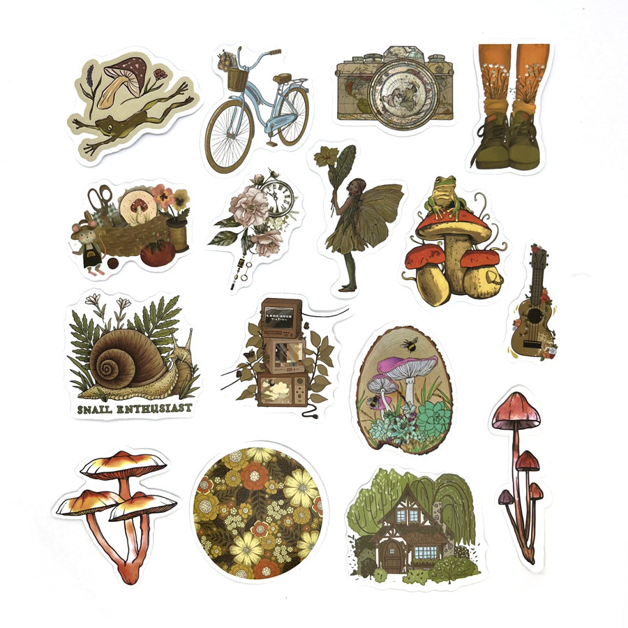 Syksyinen tarrasetti on kokoelma lämpimän sävyisiä ja viehättäviä vintage-henkisiä kuvituksia, jotka luovat kodikkaan, luonnonläheisen ja syksyisen mökkitunnelman. Setti juhlistaa vuodenajan murrettuja sävyjä, metsän antimia ja maalaiselämän estetiikkaa, sisältäen aiheita kuten sieniä, etanoita, vanhoja polkupyöriä, retrokameroita, keijuja, pientä mökkiä sekä suloisia hahmoja, kuten sammakoita ja hiiriä.